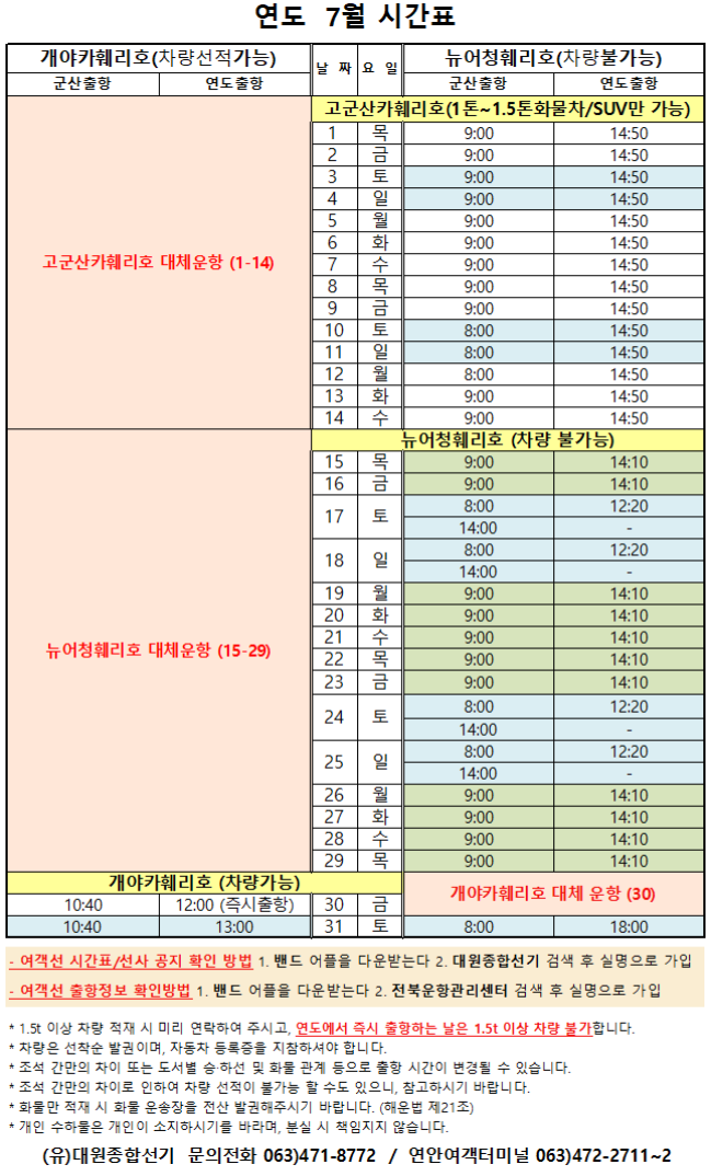 여객선 안내 -군산 연안여객터미널 (유) 대원종합선기 1644-8774 (임해로 378-8)(어청도 개야도 연도)