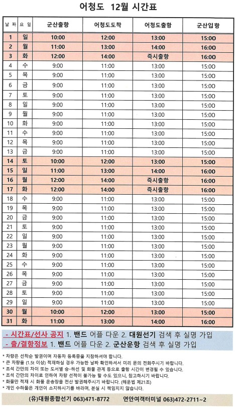 고군산 군도 섬여행 선박 운행 시간표 안내입니다.