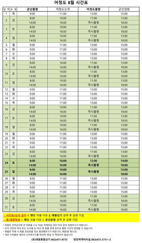 고군산 군도 섬여행 선박 운행 시간표 안내입니다.
