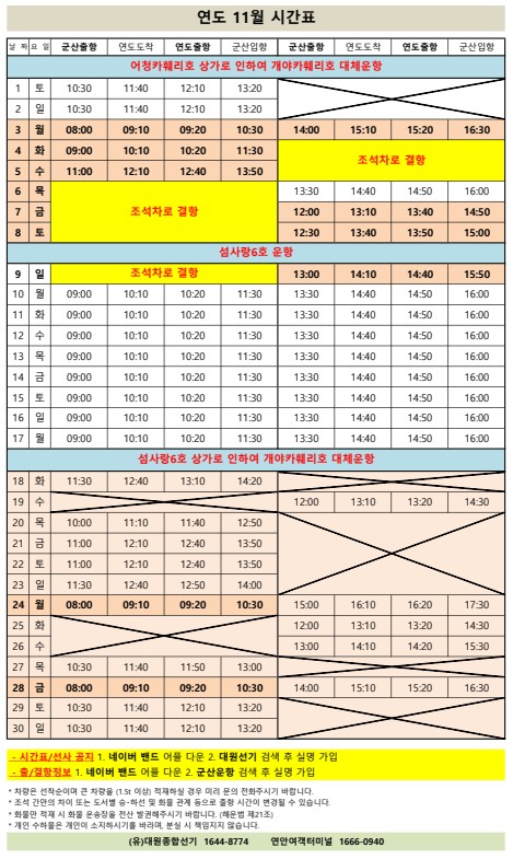 | 776 | 연도 | 2025 | 11 | 연도 11월 여객선 시간표 안내 |