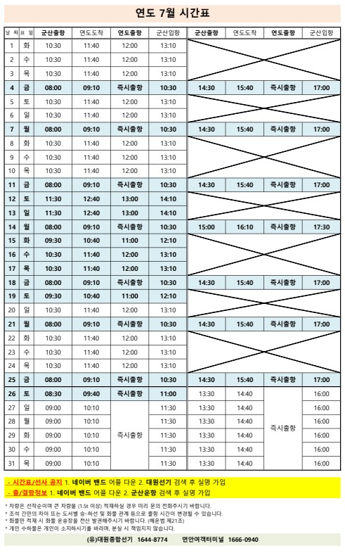| 731 | 연도 | 2025 | 7 | 연도 7월 여객선 시간표 안내 |