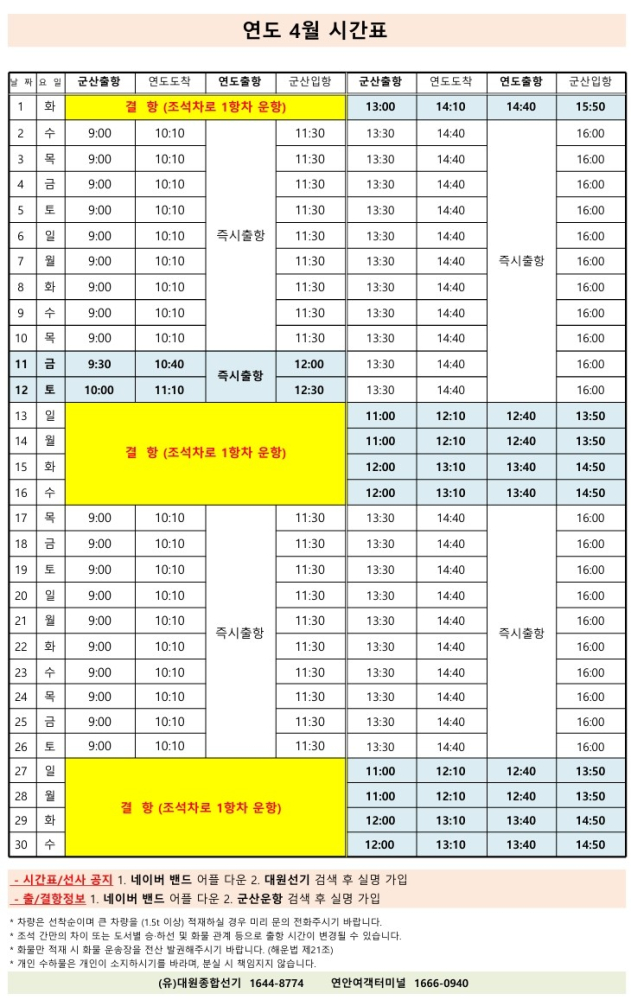 여객선 안내 -군산 연안여객터미널 (유) 대원종합선기 1644-8774 (임해로 378-8)(어청도 개야도 연도)