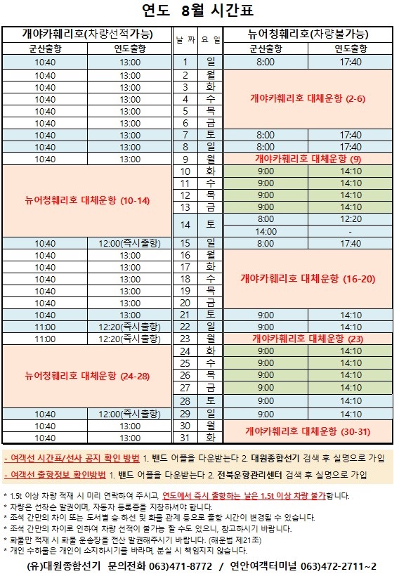 문화관광국 관광진흥과 에서 제작한 여객선 시간표 저작물은 "공공누리" 출처표시-상업적 이용금지-변경금지 조건에 따라 이용 할 수 있습니다.