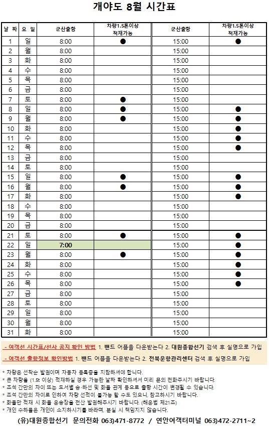 어청도 8월 여객시간표