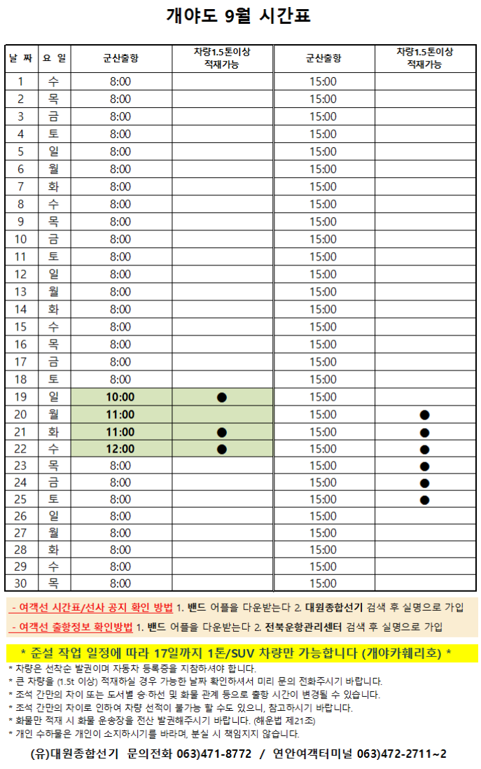 9월 개야도 여객시간표 알림