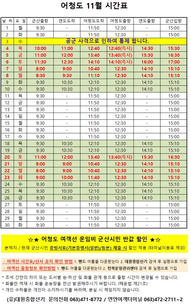 문화관광국 관광진흥과 에서 제작한 여객선 시간표 저작물은 "공공누리" 출처표시-상업적 이용금지-변경금지 조건에 따라 이용 할 수 있습니다.