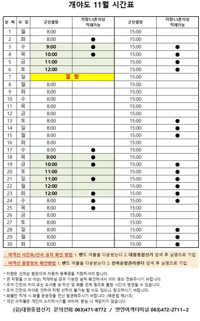 문화관광국 관광진흥과 에서 제작한 여객선 시간표 저작물은 "공공누리" 출처표시-상업적 이용금지-변경금지 조건에 따라 이용 할 수 있습니다.