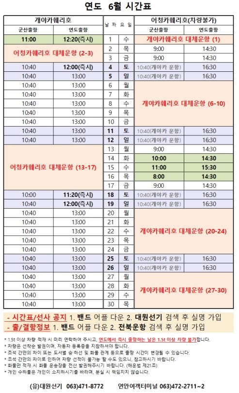 문화관광국 관광진흥과 에서 제작한 여객선 시간표 저작물은 "공공누리" 출처표시-상업적 이용금지-변경금지 조건에 따라 이용 할 수 있습니다.