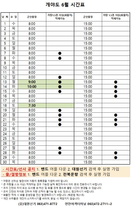 6월 개야도 여객시간표 알림