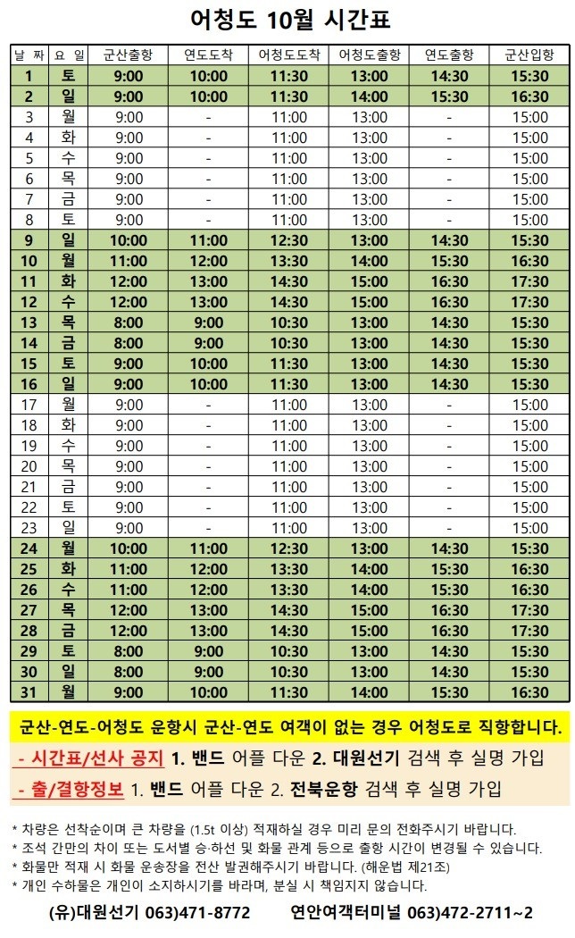 10월 어청도 여객시간표