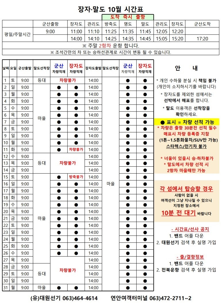 10월 방축도 여객시간표 알림