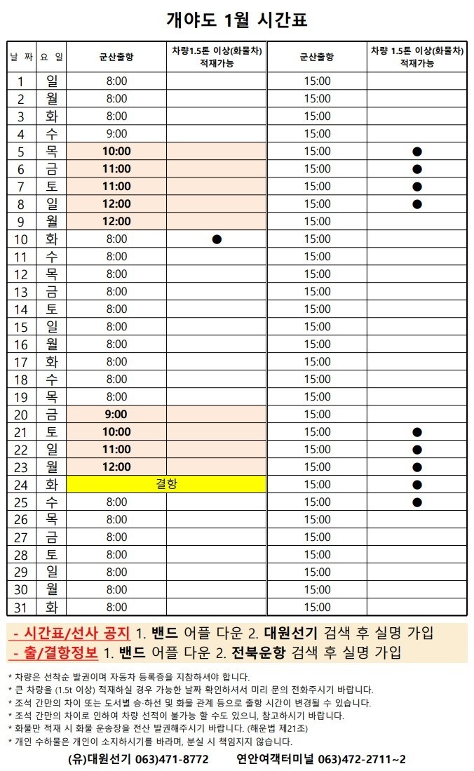 문화관광국 관광진흥과 에서 제작한 여객선 시간표 저작물은 "공공누리" 출처표시-상업적 이용금지-변경금지 조건에 따라 이용 할 수 있습니다.