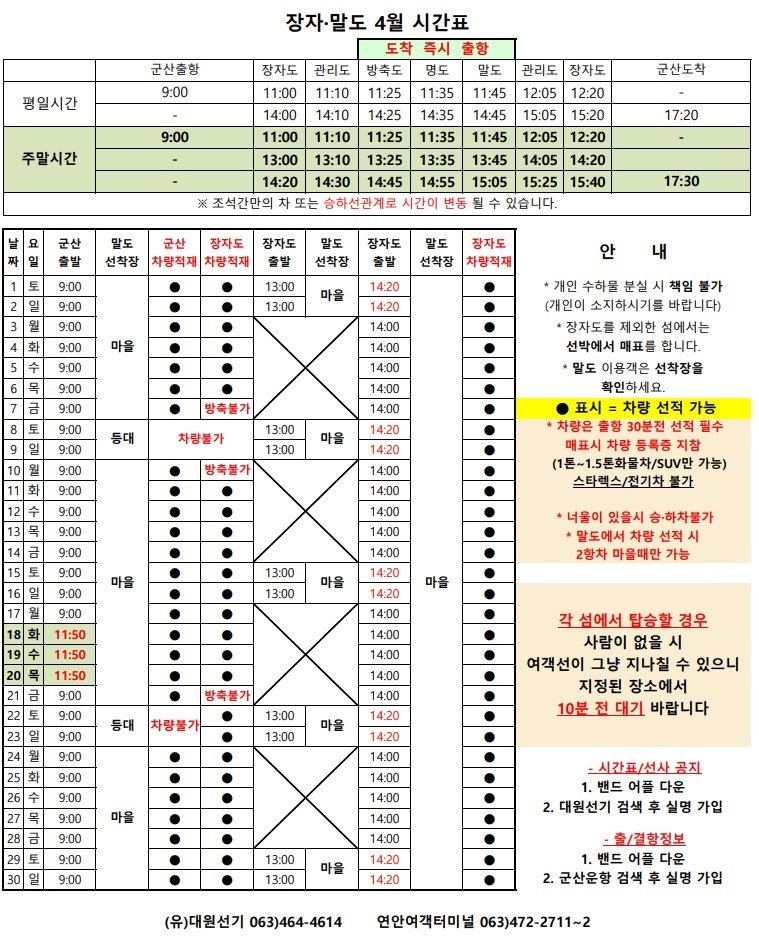 방축도 4월 여객시간표