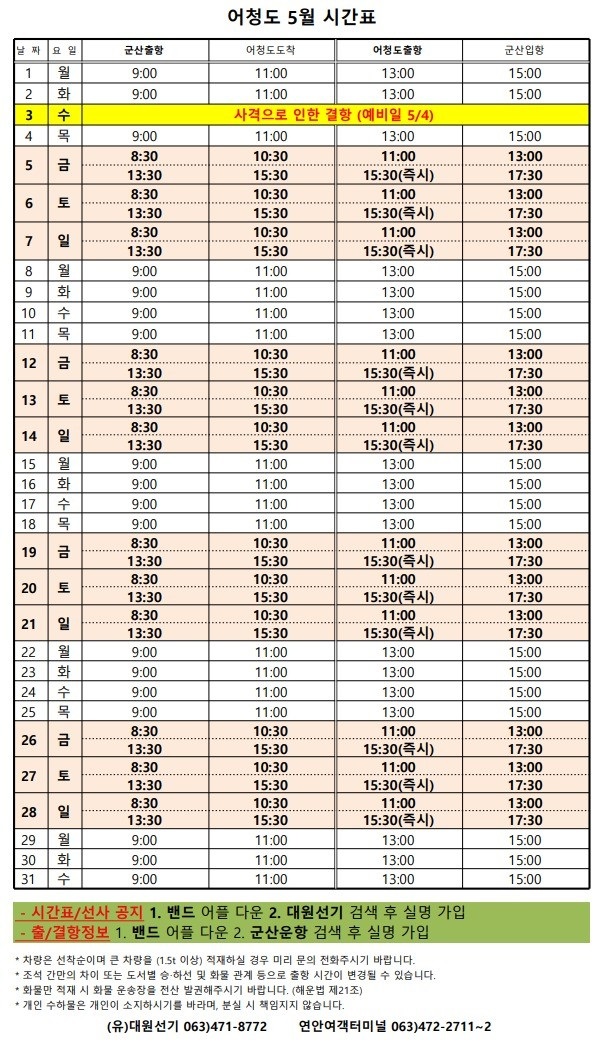 문화관광국 관광진흥과 에서 제작한 여객선 시간표 저작물은 "공공누리" 출처표시-상업적 이용금지-변경금지 조건에 따라 이용 할 수 있습니다.