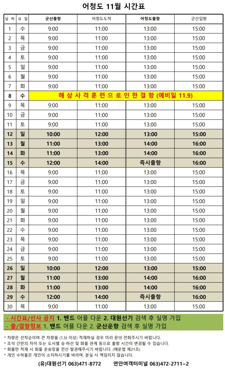 장자도 11월 여객시간표 알림
