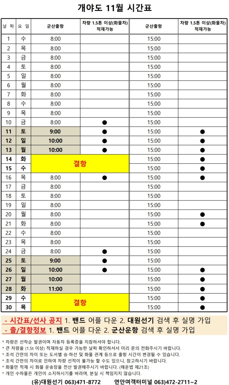 개야도 11월 여객시간표 알림