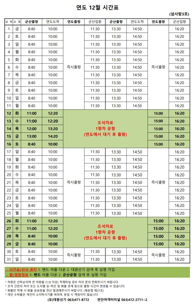 문화관광국 관광진흥과 에서 제작한 여객선 시간표 저작물은 "공공누리" 출처표시-상업적 이용금지-변경금지 조건에 따라 이용 할 수 있습니다.