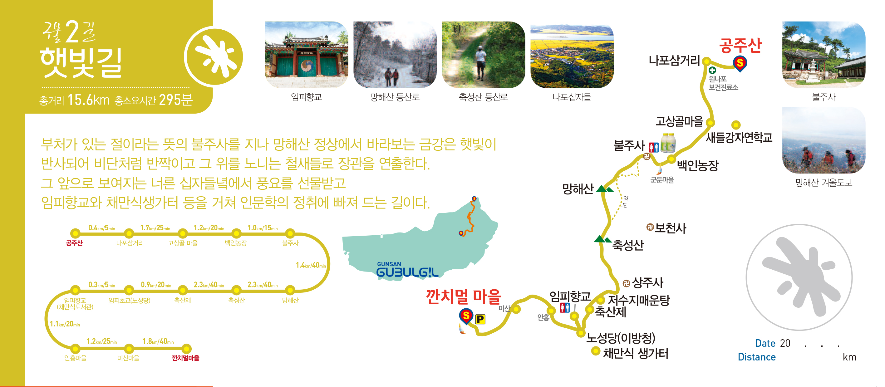 총거리 15.6Km 총소요시간295분부처가 있는 절이라는 뜻의 불주사를 지나 망해산 정상에서 바라보는 금강은 햇빛이 반사되어 비단처럼 반짝이고 그 위를 노니는 철새들로 장관을 연출한다. 그 앞으로 보여지는 너른 십자들에서 풍요를 선물받고 임피향교와 채만식생가터 등을 거쳐 인문학의 정취에 빠져 드는 길이다