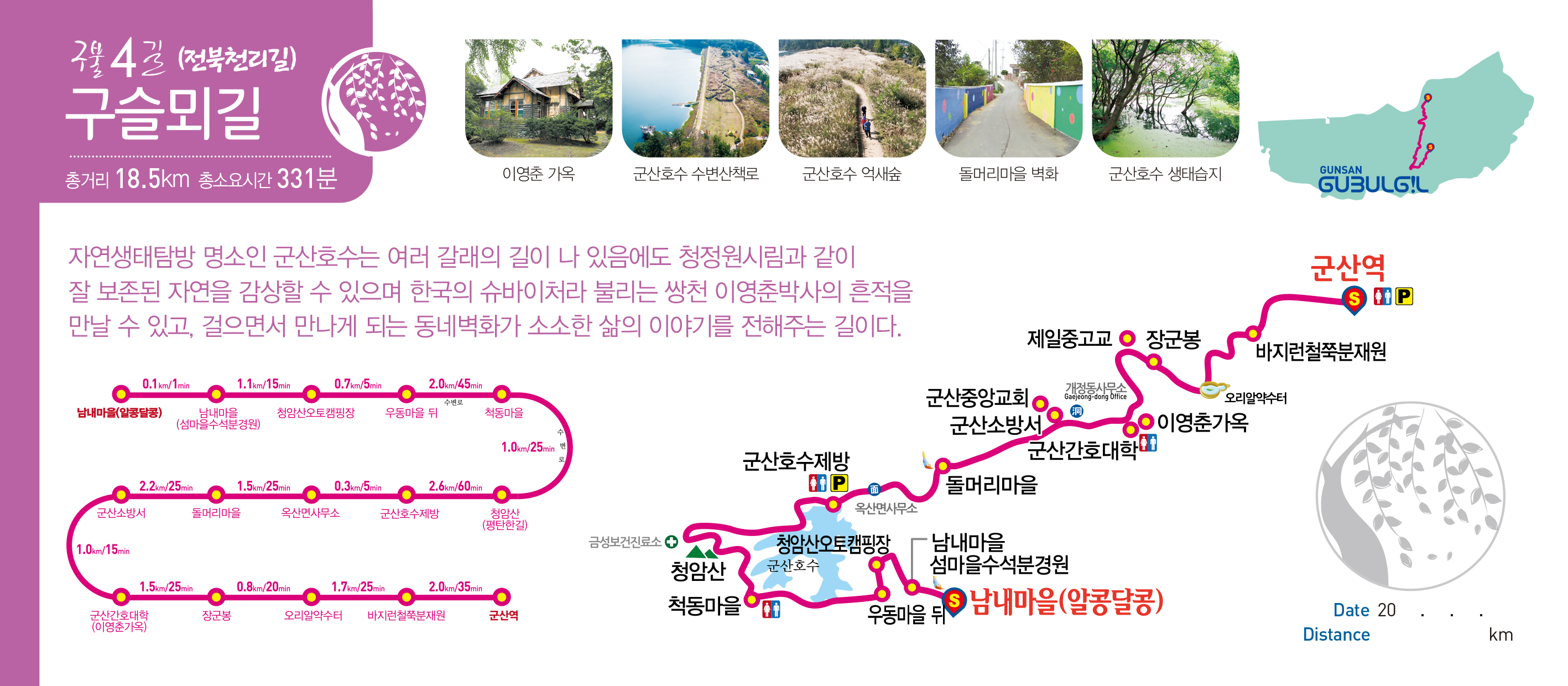 총거리 18.5Km 총소요시간331분자연생태탐방 명소인 군산호수는 여러 갈래의 길이 나 있음에도 청정원시림과 같이 잘 보존된 자연을 감상할 수 있으며 한국의 슈바이처라 불리는 쌍천 이영춘박사의 흔적을 만날 수 있고, 걸으며 만나게 되는 동네벽화가 소소한 삶의 이야기를 전해주는 길이다.